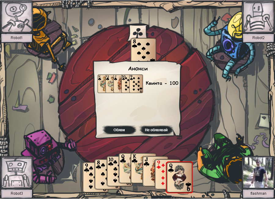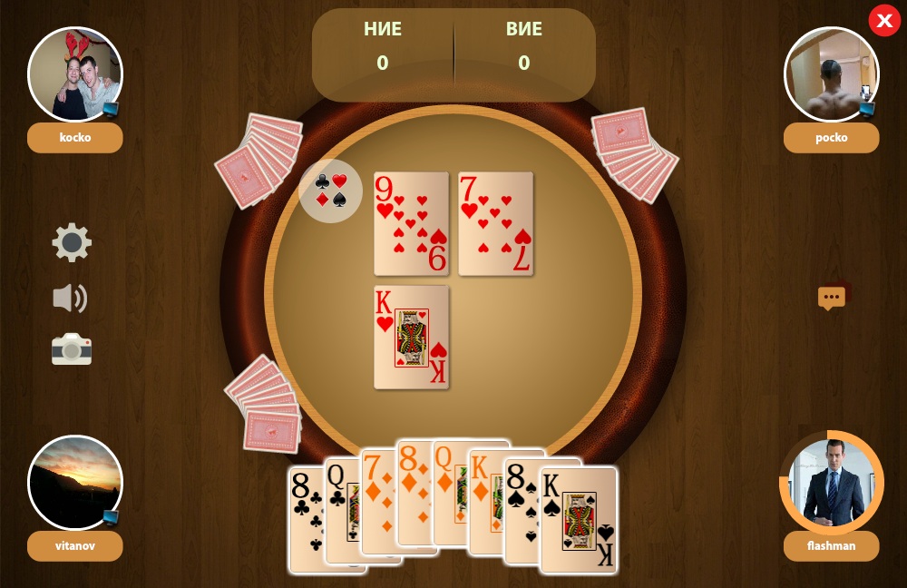 Играта започва седящият в дясно от раздаващия, като поставя една от своите карти на масата (тя определя "исканият" цвят). Всеки следващ играч поставя карта от същия цвят. Взятката (ръката) печели играчът който е поставил най-висока карта (или коз). Играчът, който е спечелил взятката събира картите, прибира ги при себе си (с лицето надолу) и започва следващият кръг, като играе произволна карта и т.н.
